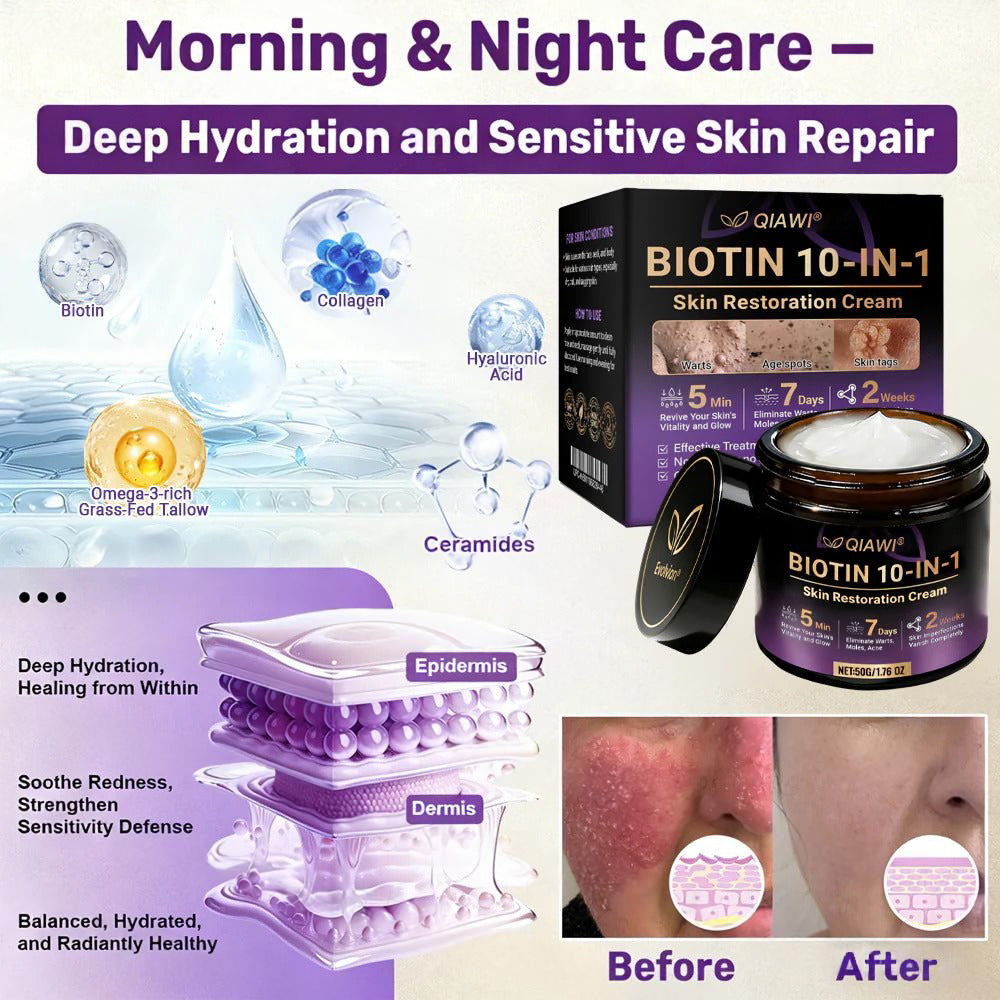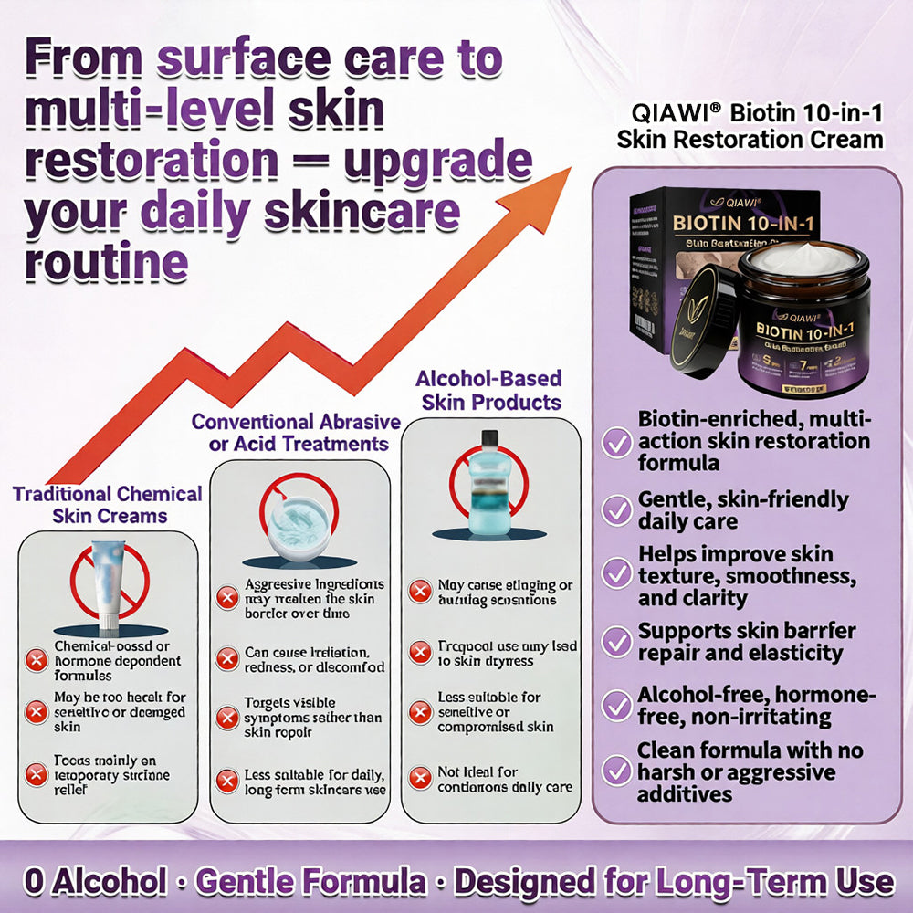 In response, QIAWI® Biotin 10-in-1 Skin Restoration Cream was scientifically developed under rigorous standards. Its formula combines the restorative power of natural biotin and collagen, synergized with hyaluronic acid, vitamin C, centella asiatica, and over ten other potent bioactive ingredients. Together, they deliver multi-dimensional care — from deep hydration and barrier repair to anti-inflammatory relief, itch control, metabolic renewal, tissue restoration, and anti-aging nourishment. Clinically validated and produced in GMP-certified facilities compliant with U.S. and EU safety standards, this cream offers a safe, effective, and drug-free multi-repair skincare solution for dryness, inflammation, irritation, and signs of aging — restoring comfort, resilience, and lasting skin health.