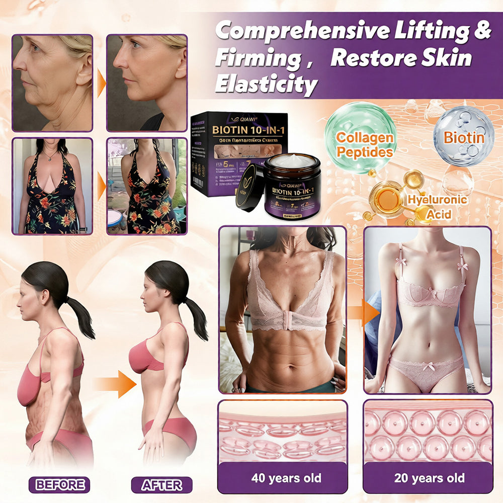 QIAWI® Biotin 10-in-1 Skin Restoration Cream combines advanced research and powerful ingredients like Biotin to rejuvenate and repair your skin. This formula boosts skin elasticity, reduces fine lines, and improves texture and tone, with up to 20 times the potency of traditional skincare. Packed with natural bioactive compounds, it hydrates, enhances collagen production, and restores firmness, while addressing uneven skin tone and dryness. Manufactured to U.S. and EU quality standards, this non-invasive, daily-use cream delivers visible results safely and effectively, maintaining youthful, radiant skin.