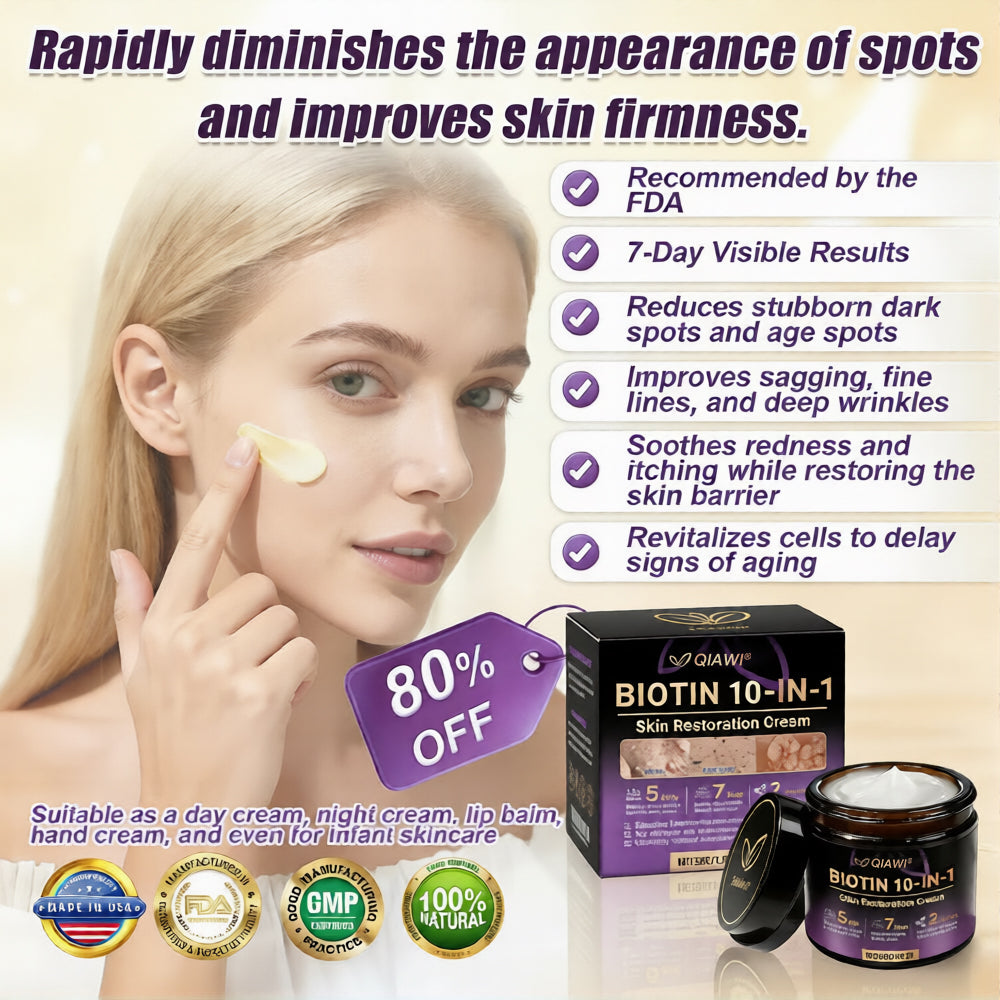 When I turned seventy, I looked more like eighty — my face was dry, rough, and full of deep lines that told every story of my life. Years of sunshine and sweet tea had left my skin dull and covered with dark age spots, and I used to laugh and say, "Guess my skin’s aging faster than I am!" But after using QIAWI® Biotin 10-in-1 Skin Restoration Cream for just a few weeks, I couldn’t believe my own reflection. The age spots began to fade, the deep wrinkles softened, and my skin actually felt smooth and alive again. It absorbs beautifully and really helps stimulate collagen and rejuvenate aging skin — something I thought was impossible at my age. Now my friends keep asking if I secretly had a facelift, and I just smile and say, "No surgery, no needles — just this little miracle in a jar"—BrendaCollins⭐⭐⭐⭐⭐