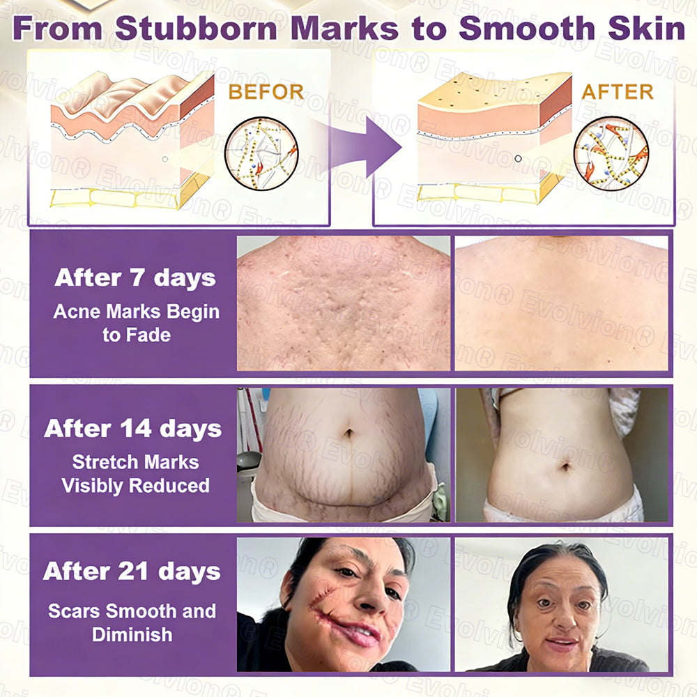 Meanwhile, biotin and collagen peptides accelerate cell renewal, and Omega-3-rich grass-fed tallow, shea butter, and jojoba oil provide essential fatty acids that restore softness and flexibility. With regular use, the skin becomes smoother, more even, and visibly renewed — scars fade, stretch marks soften, and acne marks lighten within 2–4 weeks.