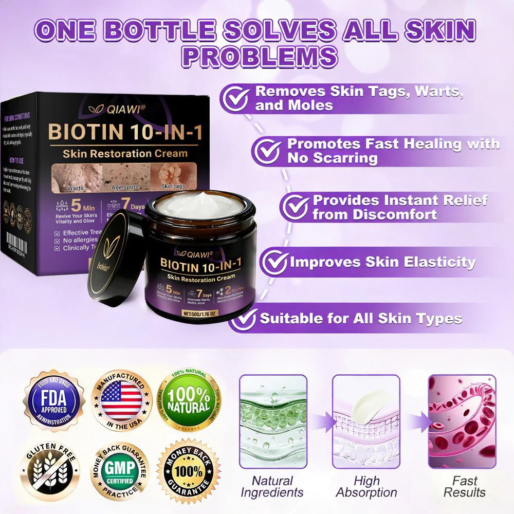 Say goodbye to the discomfort caused by skin tags, psoriasis, vitiligo, varicose veins, sagging, wrinkles, and age spots. Use QIAWI® Biotin 10-in-1 Skin Restoration Cream to restore smooth, youthful, and radiant skin without the hassle.