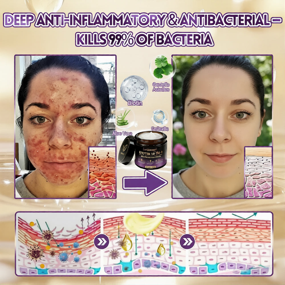 When the skin barrier weakens, bacteria and fungi can easily invade, leading to infections, acne, and recurring inflammation. QIAWI® Biotin 10-in-1 Skin Restoration Cream helps restore the skin’s natural defense system and targets both fungal and bacterial acne at the root. Aloe vera suppresses microbial growth while soothing irritation; biotin and collagen peptides boost the skin’s immune response and stimulate collagen regeneration; and salicylic acid gently exfoliates and clears clogged pores to reduce breakouts.