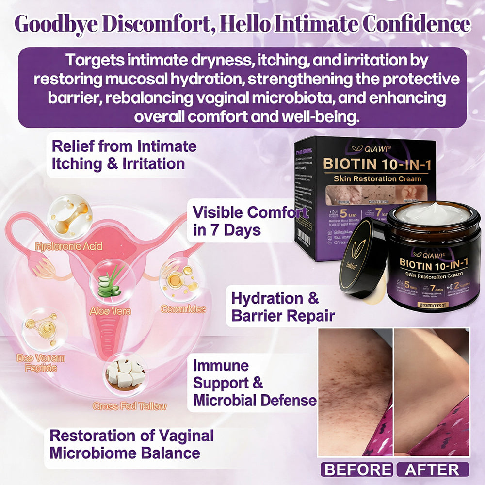 Intimate itching is often linked to dryness, microbiome imbalance, and mild inflammation. QIAWI® Biotin 10-in-1 Skin Restoration Cream offers gentle relief through a science-backed blend of soothing and moisturizing ingredients. Hyaluronic acid deeply hydrates the mucosal tissue, providing long-lasting moisture, while aloe vera calms irritation and redness. Ceramides strengthen the natural protective barrier, and biotin, collagen peptides, and Omega-3-rich grass-fed tallow help regulate local immunity and rebalance microflora by promoting healthy Lactobacillus growth.