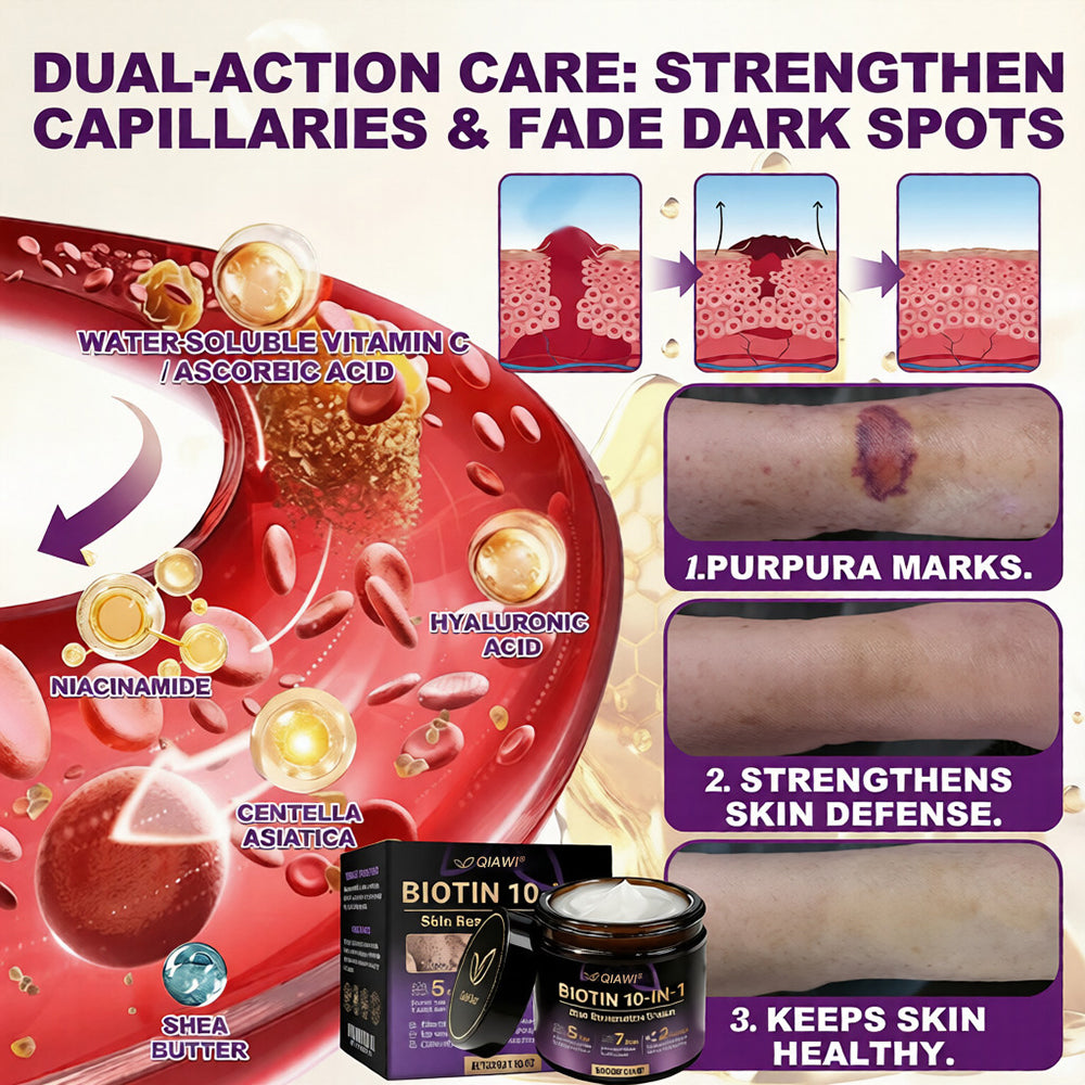 Age spots and senile purpura are often caused by sun exposure and fragile capillaries. QIAWI® Biotin 10-in-1 Skin Restoration Cream combines alpha-arbutin, water-soluble vitamin C, and hyaluronic acid to brighten the complexion, visibly improving uneven pigmentation within 7 days. Centella asiatica strengthens capillaries, helping purpura fade by up to 68% in 14 days. Biotin and collagen peptides accelerate the natural shedding of pigmented cells, boosting skin renewal efficiency by 35%.