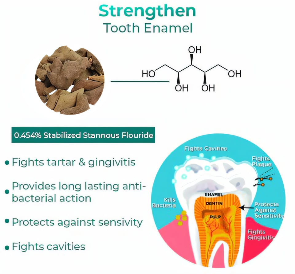 Citric acid: is a naturally occurring acid that may be found in citrus fruits such as lemons, limes, and oranges. Its ability to eliminate tartar accumulation and boost general dental health makes it a prominent ingredient in oral care products. The ability of citric acid to dissolve mineral deposits on teeth is one of its main benefits for tartar eradication. Citric acid also contains antibacterial characteristics that can aid in the reduction of dangerous germs in the mouth. This can assist to prevent plaque and tartar buildup, as well as lower the risk of tooth decay and gum disease.